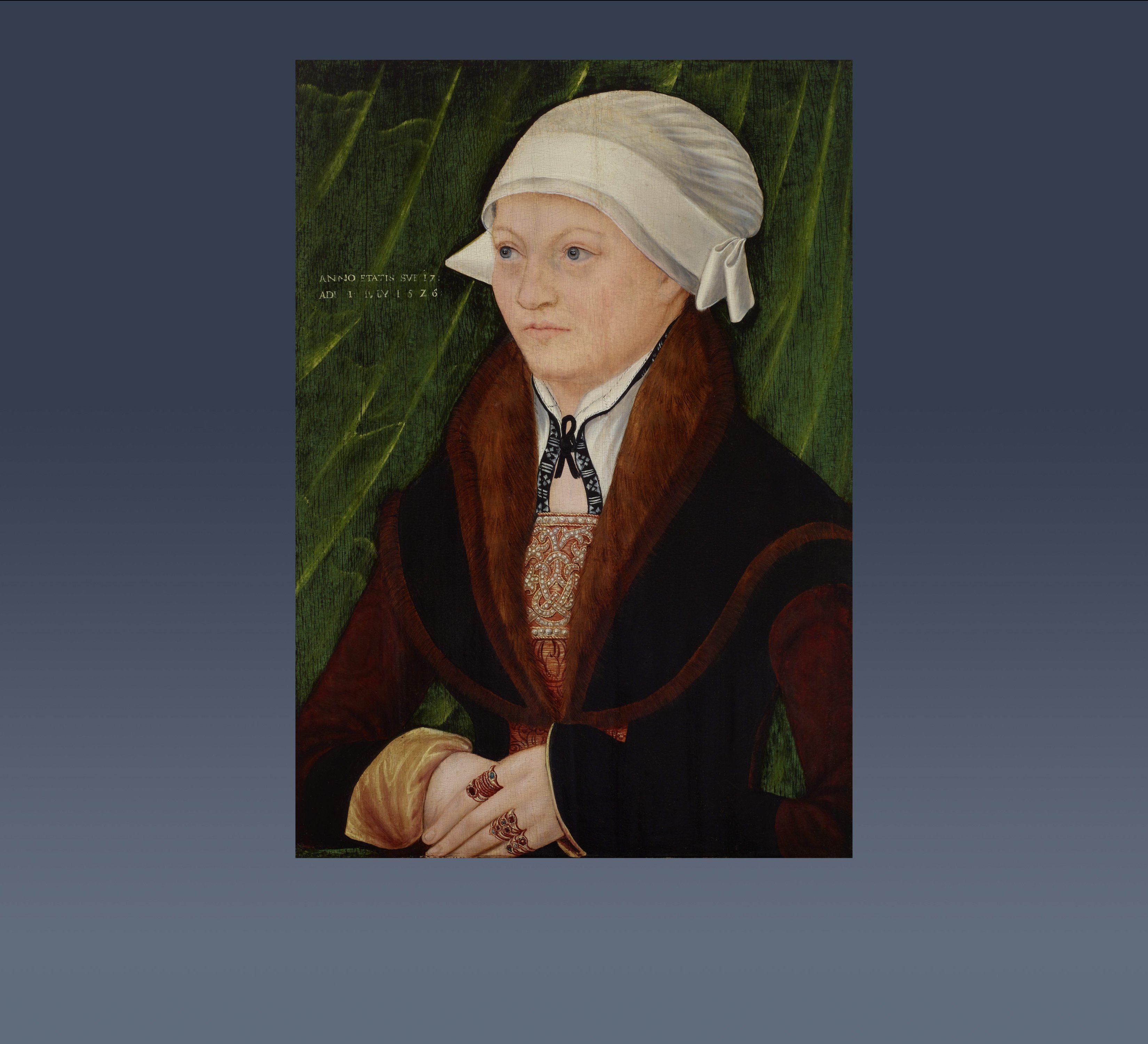 The male pendant of this pair of marriage portraits: C.f. Görres, cda 2014, 'Portrait of a Gentleman in a Fur-trimmed Cloak', in: Cranach Digital Archive, https://lucascranach.org/de/PRIVATE_NONE-P045/,
