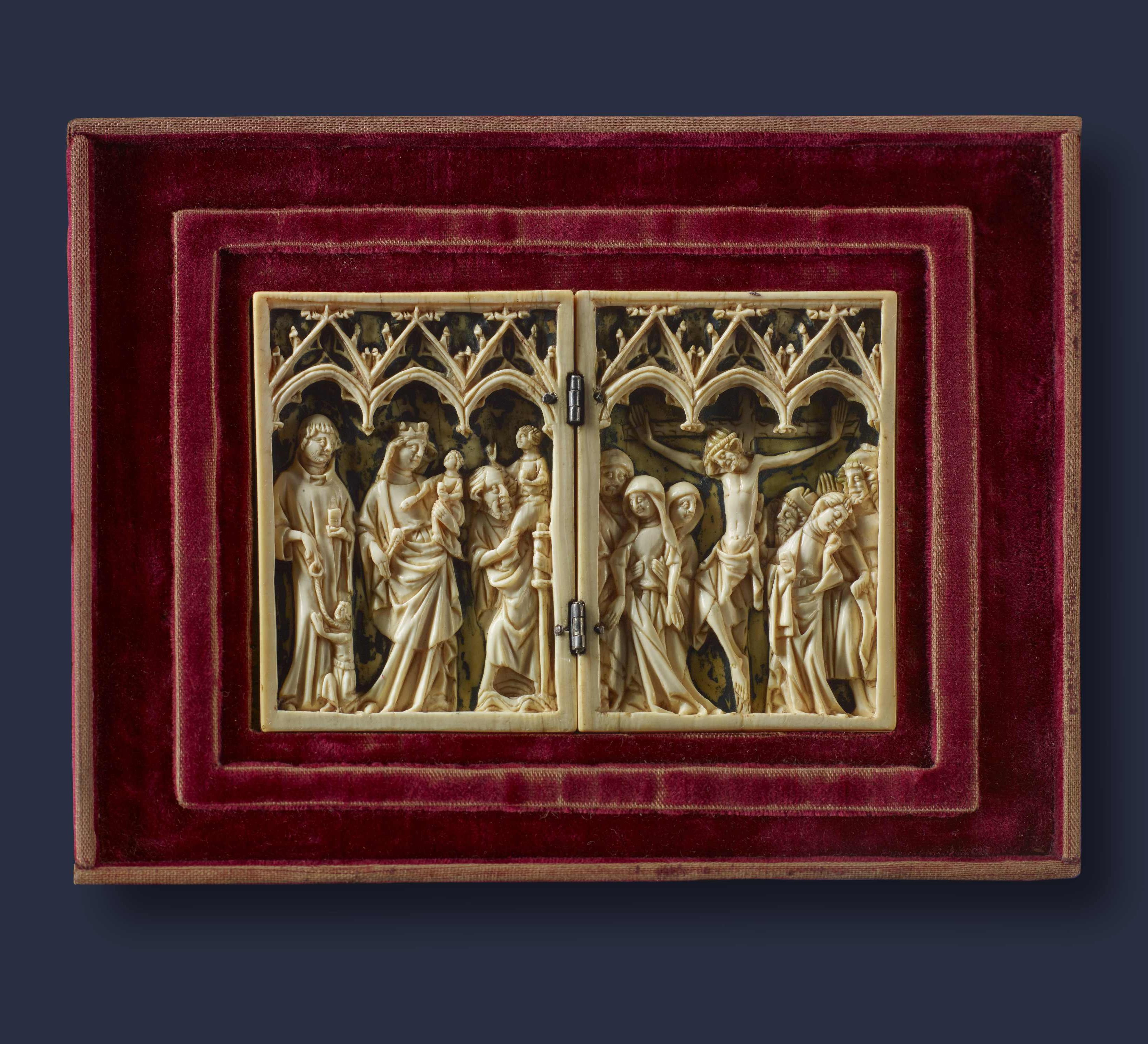 Sold Left panel: Virgin and Child, St. Leonard, St. Christopher Right panel: Crucifixion scene Ivory, with traces of old polychromy Height: 7.6 cm, width: 11.2 cm, depth: 0.6 cm