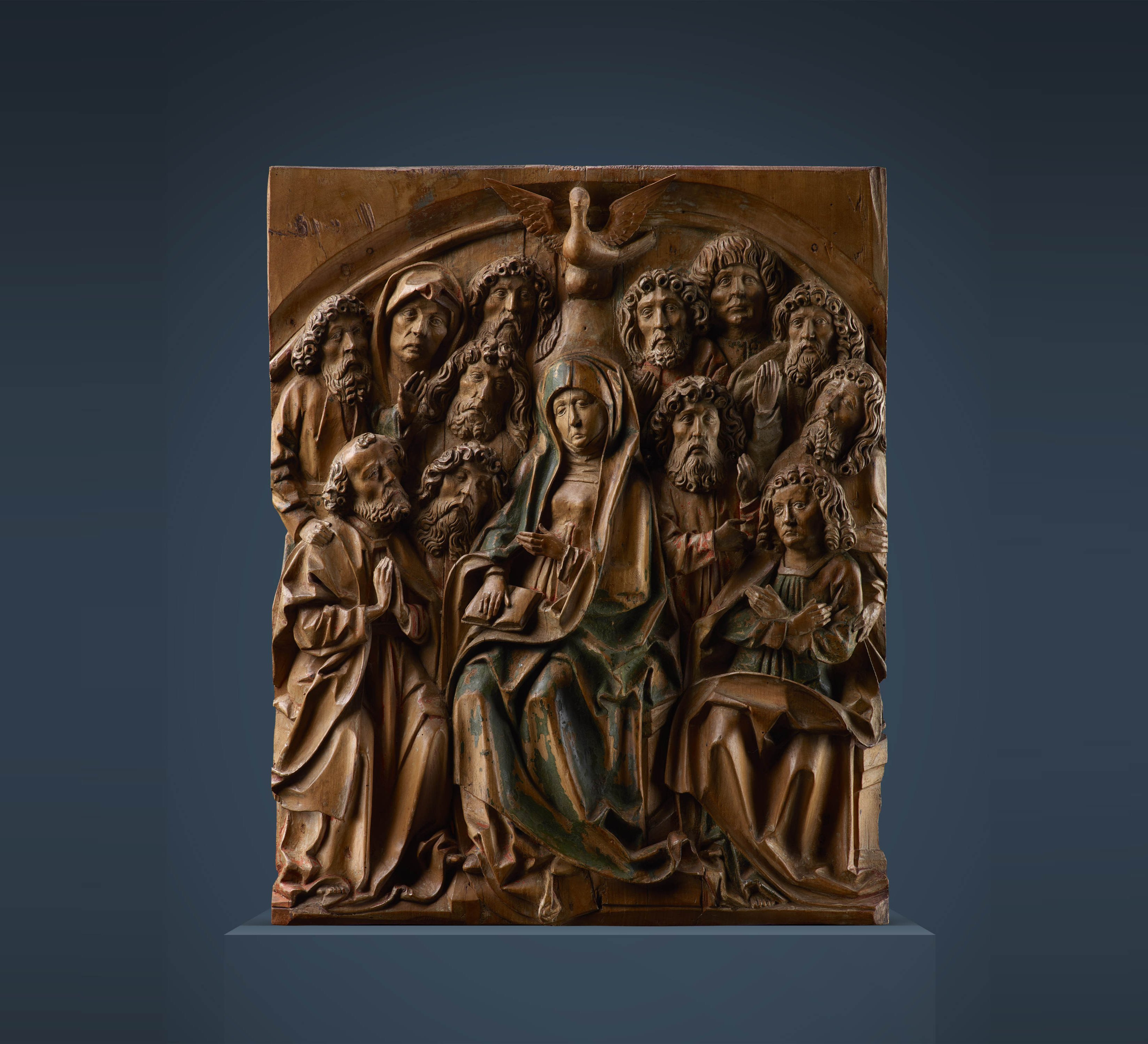 SOLD The Virgin Mary, surrounded by the apostles, above the Holy Spirit as a dove. Relief, lime wood, traces of old polychromy Height: 56.5 cm, width: 45.5 cm