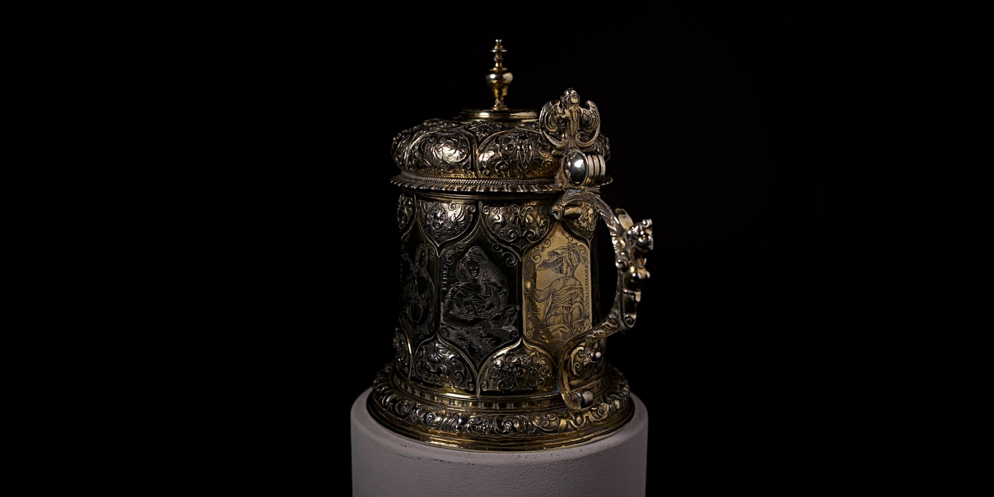 faceted, octagonal body, engraved with allegories of the seven heavenly virtues and patience, based on engravings from 1595 by Jacob Matham (1571–1631, active in Haarlem), after Hendrik Goltzius (1558–1617).